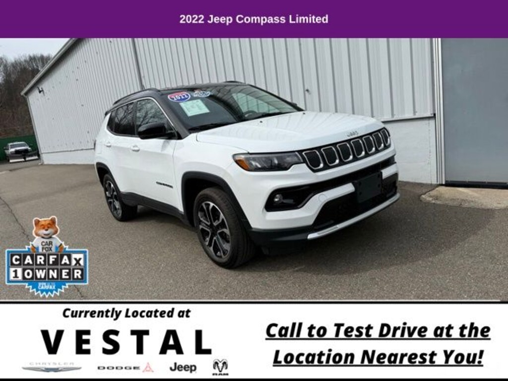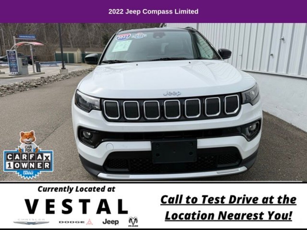 4WD, 10.1" Touchscreen Display, 3.73 Axle Ratio, 4-Wheel Disc Brakes, 6 Speakers, ABS brakes, Air Conditioning, Alloy wheels, AM/FM radio: SiriusXM, Anti-whiplash front head restraints, Auto High-beam Headlights, Auto-dimming Rear-View mirror, Automatic temperature control, Brake assist, Bumpers: body-color, Compass, Delay-off headlights, Disassociated Touchscreen Display, Driver door bin, Driver vanity mirror, Dual front impact airbags, Dual front side impact airbags, Electronic Stability Control, Emergency communication system: SiriusXM Guardian, Four wheel independent suspension, Front anti-roll bar, Front Bucket Seats, Front Center Armrest w/Storage, Front dual zone A/C, Front fog lights, Front reading lights, Fully automatic headlights, Global Telematics Box Module (TBM), Gloss Black Exterior Mirrors, Heated door mirrors, Heated front seats, Heated steering wheel, Illuminated entry, Knee airbag, Leather Shift Knob, Leather Trimmed Bucket Seats, Low tire pressure warning, Occupant sensing airbag, Outside temperature display, Overhead airbag, Overhead console, Panic alarm, ParkView Rear Back-Up Camera, Passenger door bin, Passenger vanity mirror, Power door mirrors, Power driver seat, Power steering, Power windows, Quick Order Package 2GG, Radio: Uconnect 5 w/10.1" Display, Rain sensing wipers, Rear anti-roll bar, Rear seat center armrest, Rear window defroster, Rear window wiper, Remote keyless entry, Roof rack: rails only, Security system, Speed control, Split folding rear seat, Spoiler, Steering wheel mounted audio controls, Tachometer, Telescoping steering wheel, Tilt steering wheel, Traction control, Trip computer, Turn signal indicator mirrors, Variably intermittent wipers, Wheels: 18" x 7" Painted Diamond Cut Aluminum, 4WD. 2022 Jeep Compass 4D Sport Utility Limited Bright White Clearcoat 4WD 9-Speed 948TE Automatic 2.4L I4