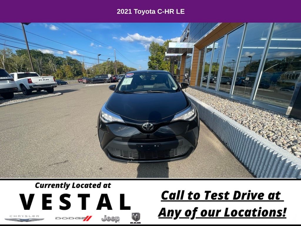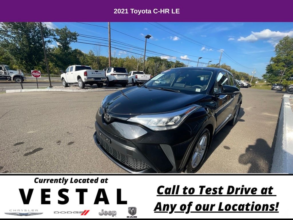 One Owner, Accident Free History, 4-Wheel Disc Brakes, 6 Speakers, ABS brakes, Air Conditioning, AM/FM radio: SiriusXM, Auto High-beam Headlights, Auto-dimming Rear-View mirror, Automatic temperature control, Axle Ratio: TBD, Brake assist, Bumpers: body-color, Delay-off headlights, Driver door bin, Driver vanity mirror, Dual front impact airbags, Dual front side impact airbags, Electronic Stability Control, Emergency communication system: Safety Connect with 1-year trial, Exterior Parking Camera Rear, Fabric Seat Material, Four wheel independent suspension, Front anti-roll bar, Front Bucket Seats, Front Center Armrest, Front dual zone A/C, Front reading lights, Fully automatic headlights, Heated door mirrors, Illuminated entry, Knee airbag, Leather Shift Knob, Low tire pressure warning, Occupant sensing airbag, Outside temperature display, Overhead airbag, Panic alarm, Passenger door bin, Passenger vanity mirror, Power door mirrors, Power steering, Power windows, Radio data system, Radio: AM/FM Stereo w/8" Touch-Screen Display, Rear anti-roll bar, Rear side impact airbag, Rear window wiper, Remote keyless entry, Speed control, Speed-sensing steering, Split folding rear seat, Spoiler, Tachometer, Telescoping steering wheel, Tilt steering wheel, Traction control, Trip computer, Turn signal indicator mirrors, Variably intermittent wipers, Wheels: 6.5" x 17" Steel. 2021 Toyota C-HR 4D Sport Utility LE Black FWD CVT 2.0L I4 DOHC 16V